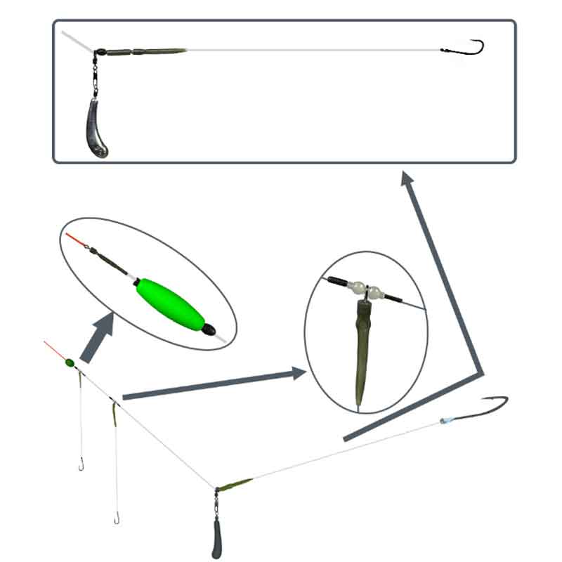 شناور سبز رنگ و سرب ۲۵ گرمی، باعث حفظ تعادل و عملکرد مناسب در آب میشود. با رها کردن نخ اصلی، شناور قلابها را در موقعیت معلق مناسب قرار میدهد و طعمهها به خوبی در معرض دید ماهی قرار میگیرند.