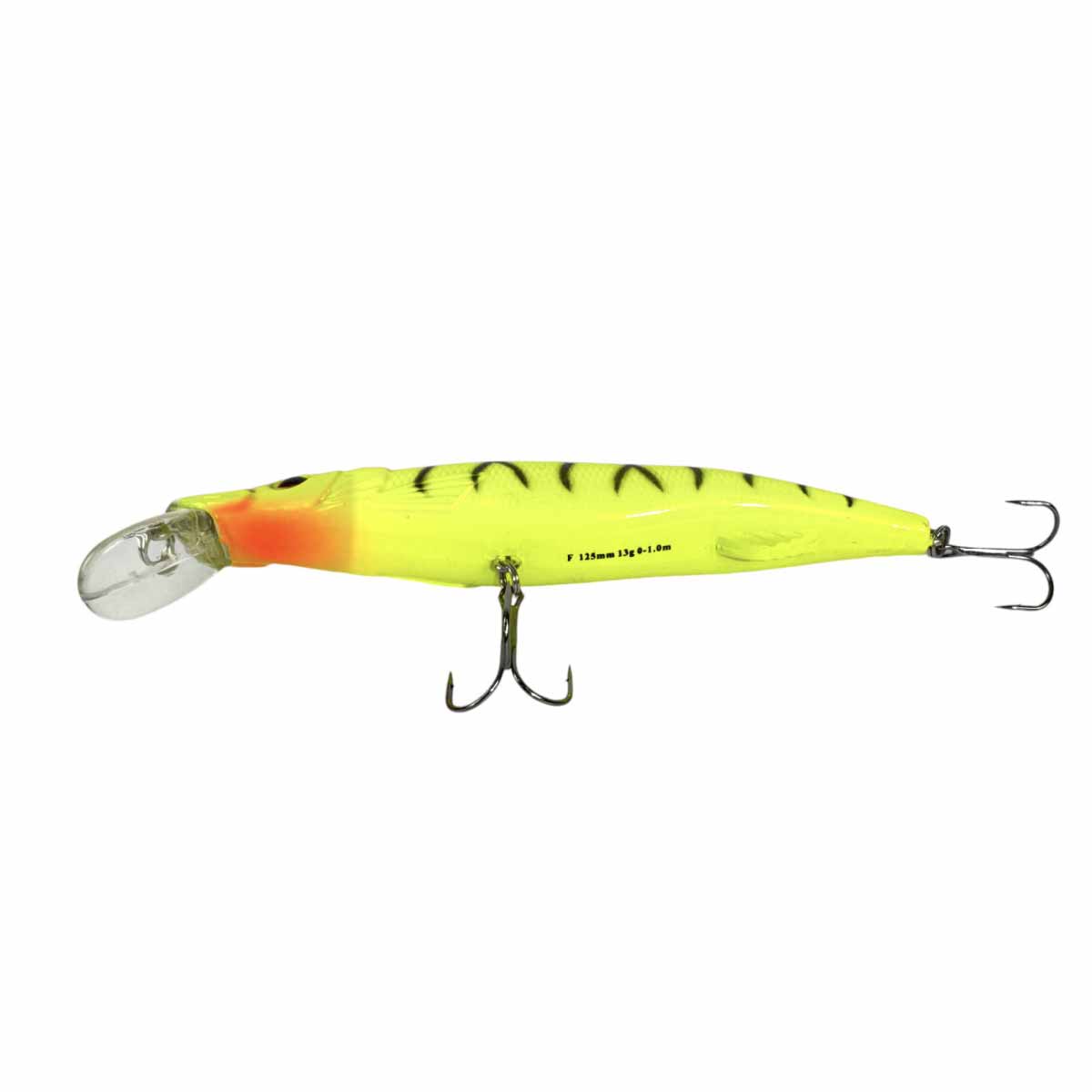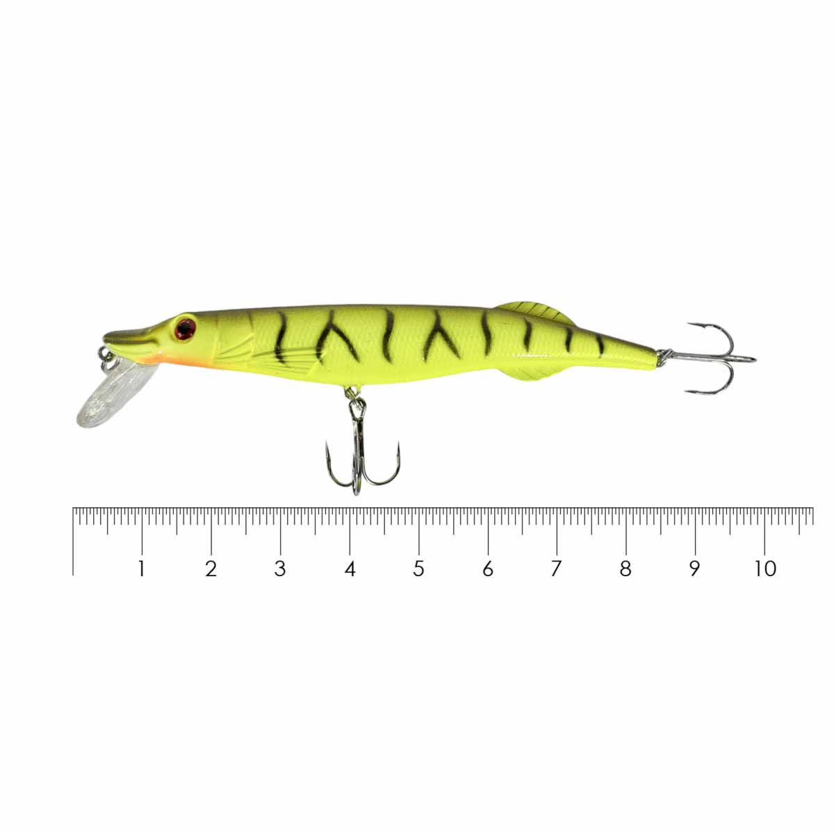 لور ماهیگیری (ووبلر) کایدا مدل KDF Pike رنگ ۶ با رنگ فسفری و خطوط تیره، انتخابی فوق‌العاده برای جذب ماهیان شکارچی در شرایط نوری ضعیف یا آب‌های کمی گل‌آلود است.